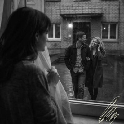 Катя стояла у окна своей съемной квартиры и смотрела на подъезд напротив. Оттуда как раз выходили двое — её муж Виктор и та самая блондинка в красном пальто. Они шли под ручку, смеялись. Виктор что-то говорил, девушка кокетливо поправляла волосы.