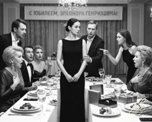 Ресторан сверкал хрусталем и позолотой. Элеонора Генриховна, затянутая в изумрудное платье, восседала во главе стола, как императрица на приеме. Гости произносили длинные тосты, вручали бархатные коробочки, конверты толщиной с кирпич и огромные букеты роз.