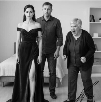 Она дёрнула ткань вниз, резко. Шов разошёлся с хрустом. Вадим в тот же момент схватил меня за плечи — типа помогает удержаться. Людмила Петровна продолжала тянуть, пока платье не треснуло почти до бедра.