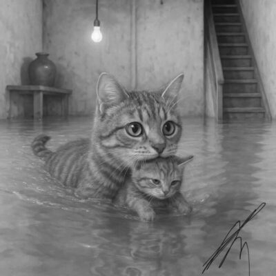 Задремав среди воспоминаний, кошка крепко спала в подвале, прижимая к себе четырёх новорождённых котят. Ночью её разбудил странный шум — где-то рядом плескалась вода. Подняв голову, она с ужасом поняла: ящик, в котором они лежали, больше не стоял на полу — он плыл.