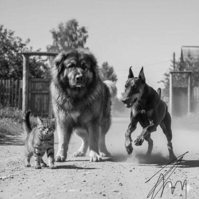 …потом он с рыком льва или, наверное, рёвом медведя бросился на бежавшего за котом доберманом.